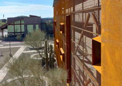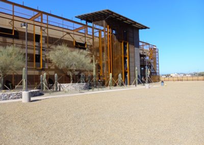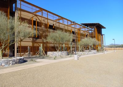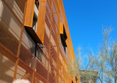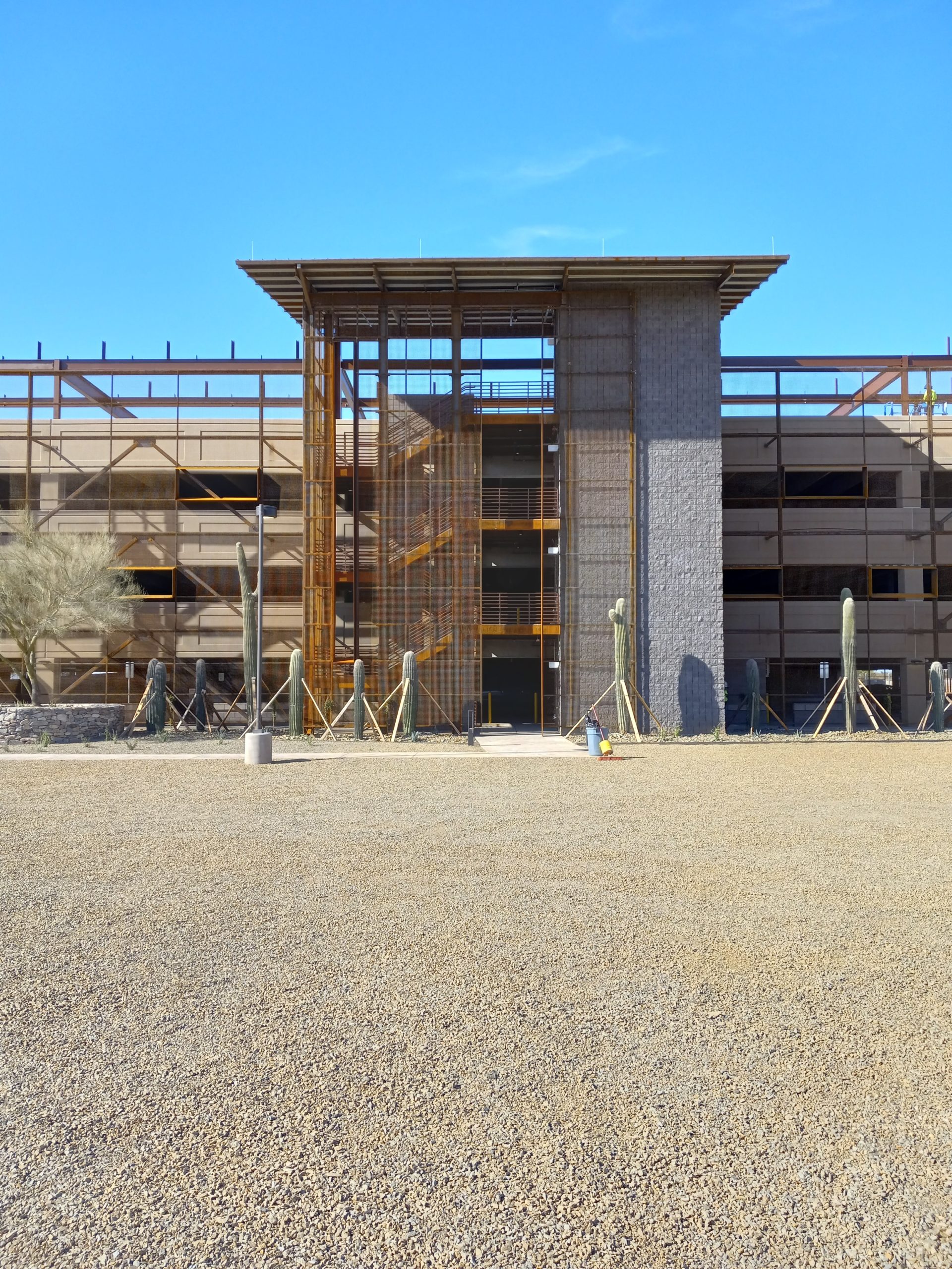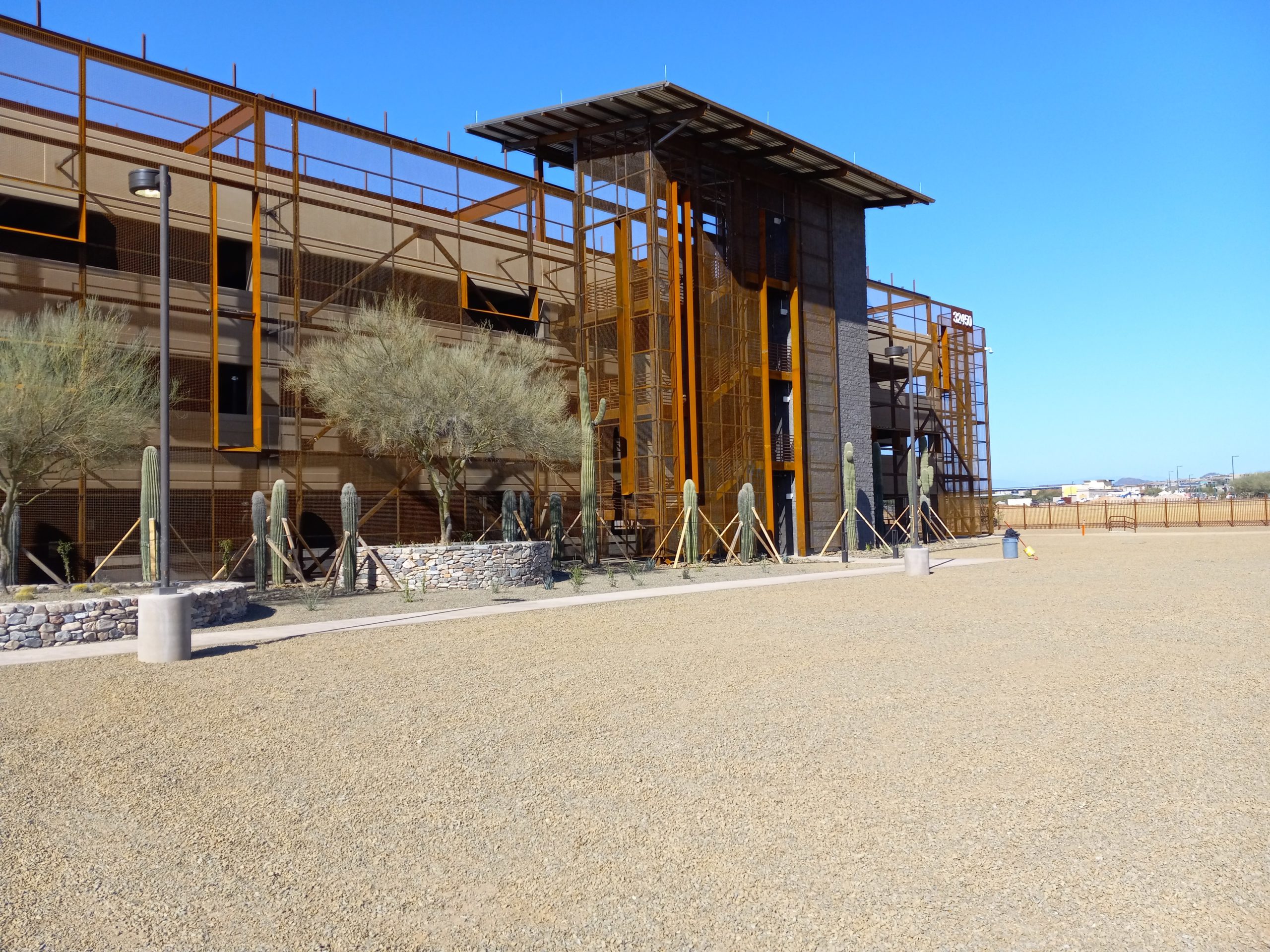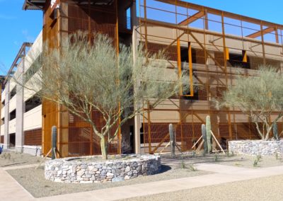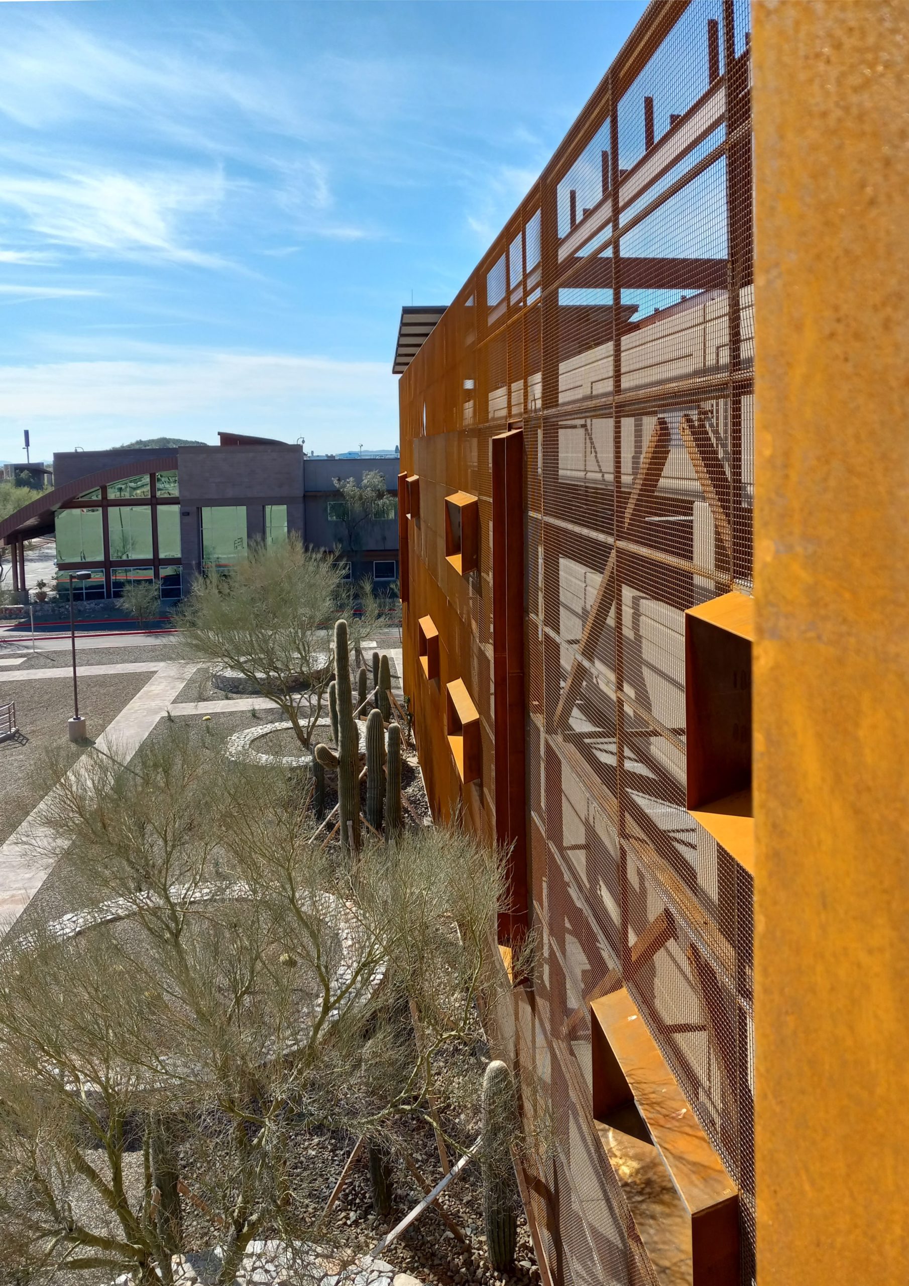 Located in the heart of the Sonoran Desert, a chief end for this project was to create an outdoor refuge where associates could traverse and engage in a setting that acknowledged and enjoyed the natural beauty of the desert. We were commissioned to develop 3 new structures; a 4-story Parking Garage, Training Center, and Administration Building, and as a result an outdoor plaza would emerge in the space between. Stair-towers and the entire eastern face of the garage were clad in a Corten steel-mesh creating opportunities for vegetation to arise and establish this haven in the desert.